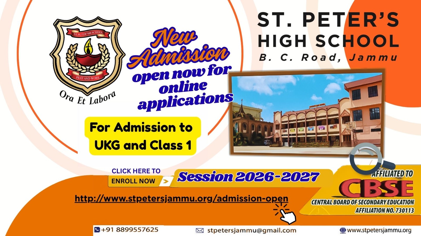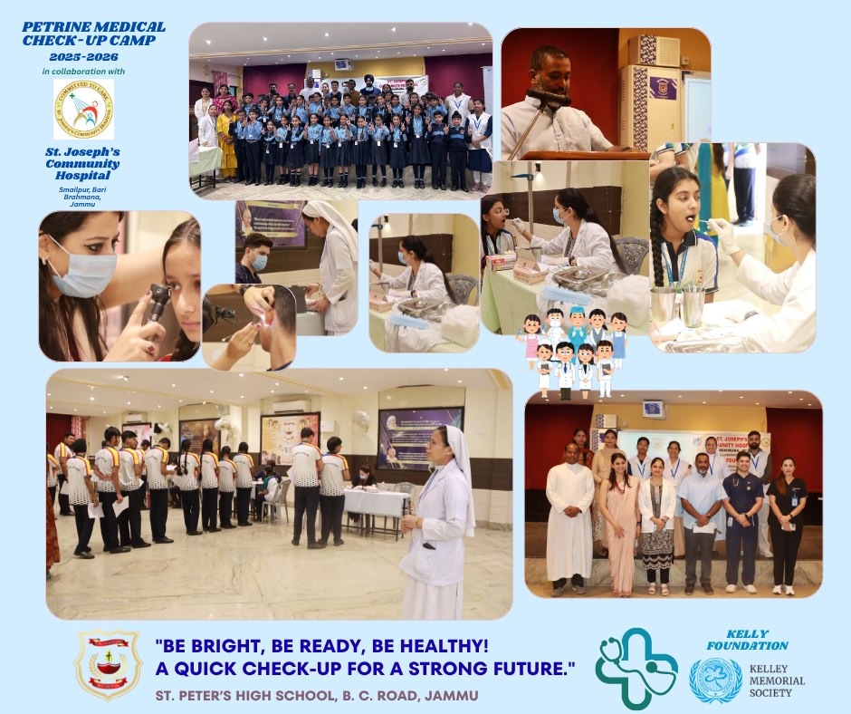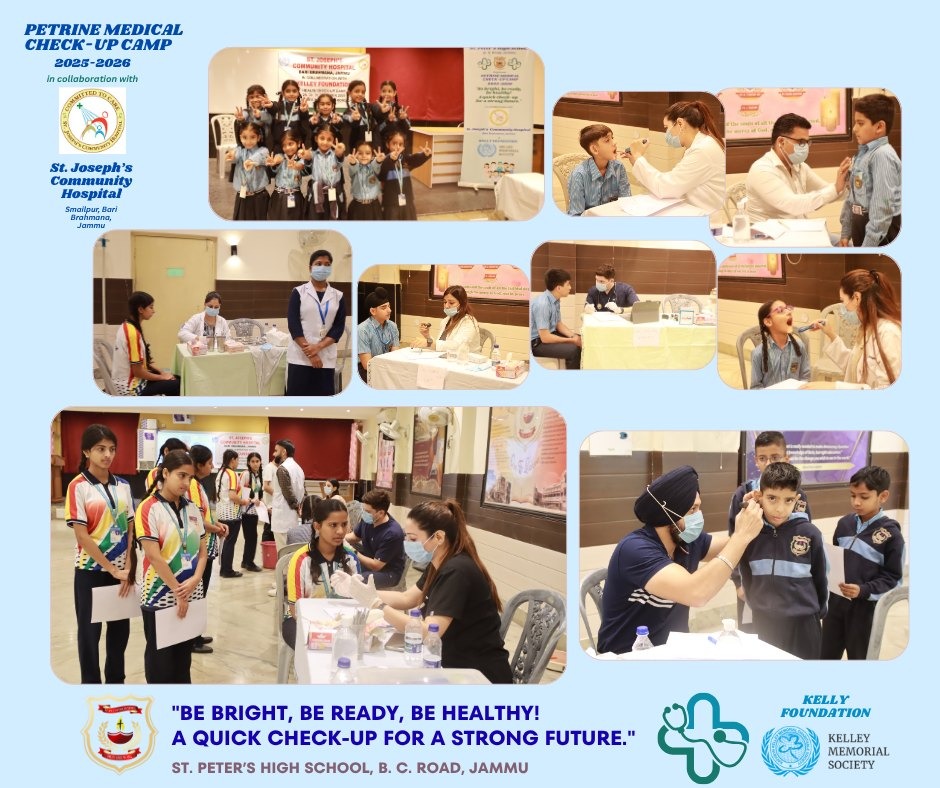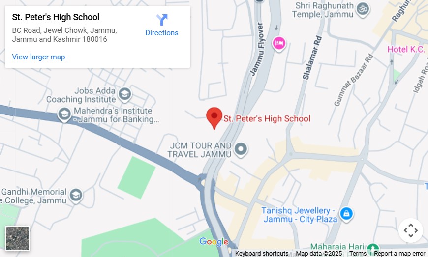 St. Peter's High School is an educational institution started by Mill Hill Missionaries from London in 1952 and belongs to Roman Catholic Diocese of Jammu- Srinagar. The school is affiliated to Central Board of Secondary Education (CBSE). It is one of the 24 schools, administered and run by the "Diocese of Jammu Srinagar Education Society" (REGD), whose office is situated at the campus of St. Mary's Garrison Church, Gandhi Nagar (Jammu). St. Peter's is one of the pioneer and best schools in the city of Jammu. "Pray & Work" - Ora et Labora is our motto.